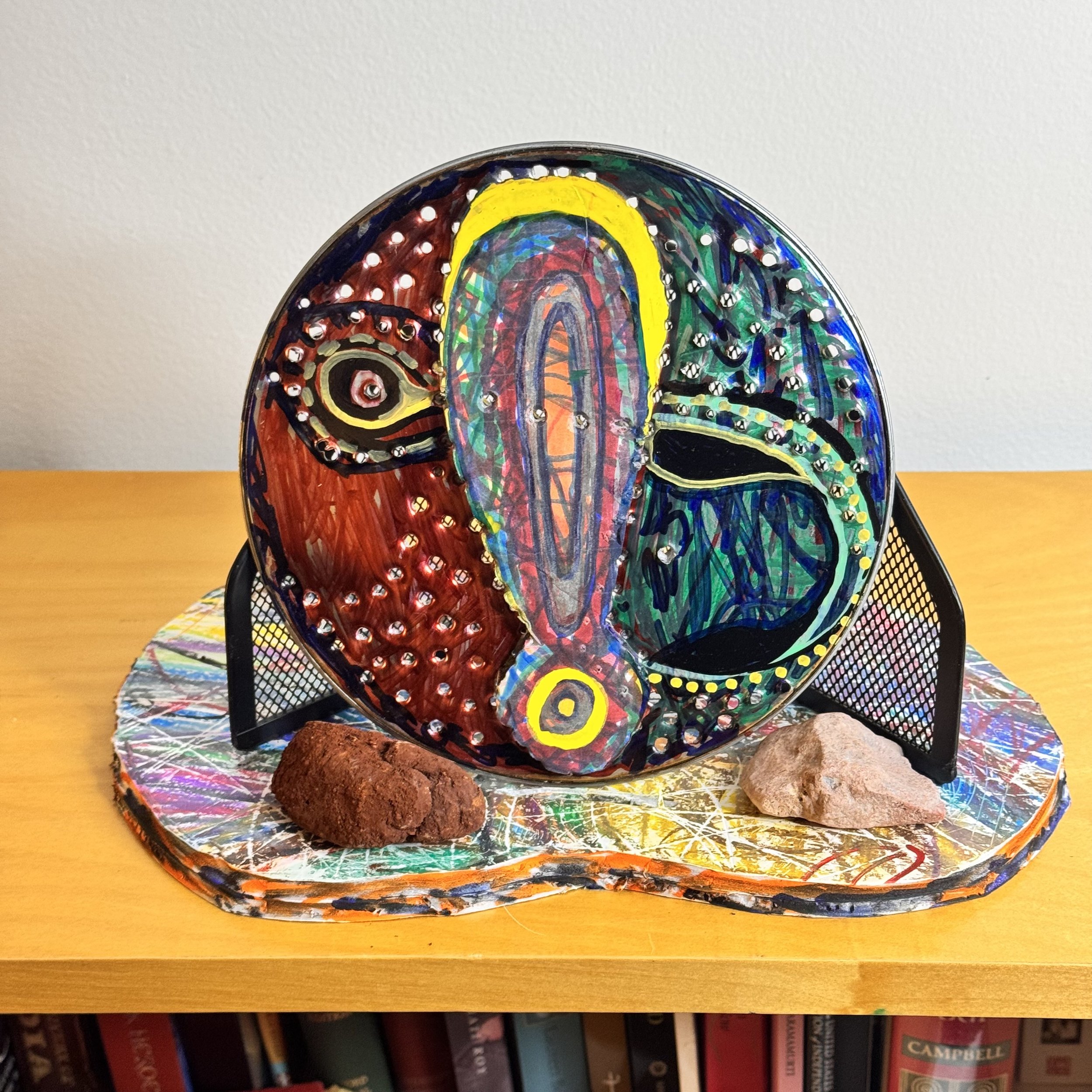 The question mark and exclamation mark are symbols I use frequently in my work. The two stones were used by Rover Thomas, a well-known Aboriginal artist from Australia, to create natural pigments for his paintings. They were gifted to me by Mary Maja in Perth, Australia, in 1995. Rover Thomas visited her often.