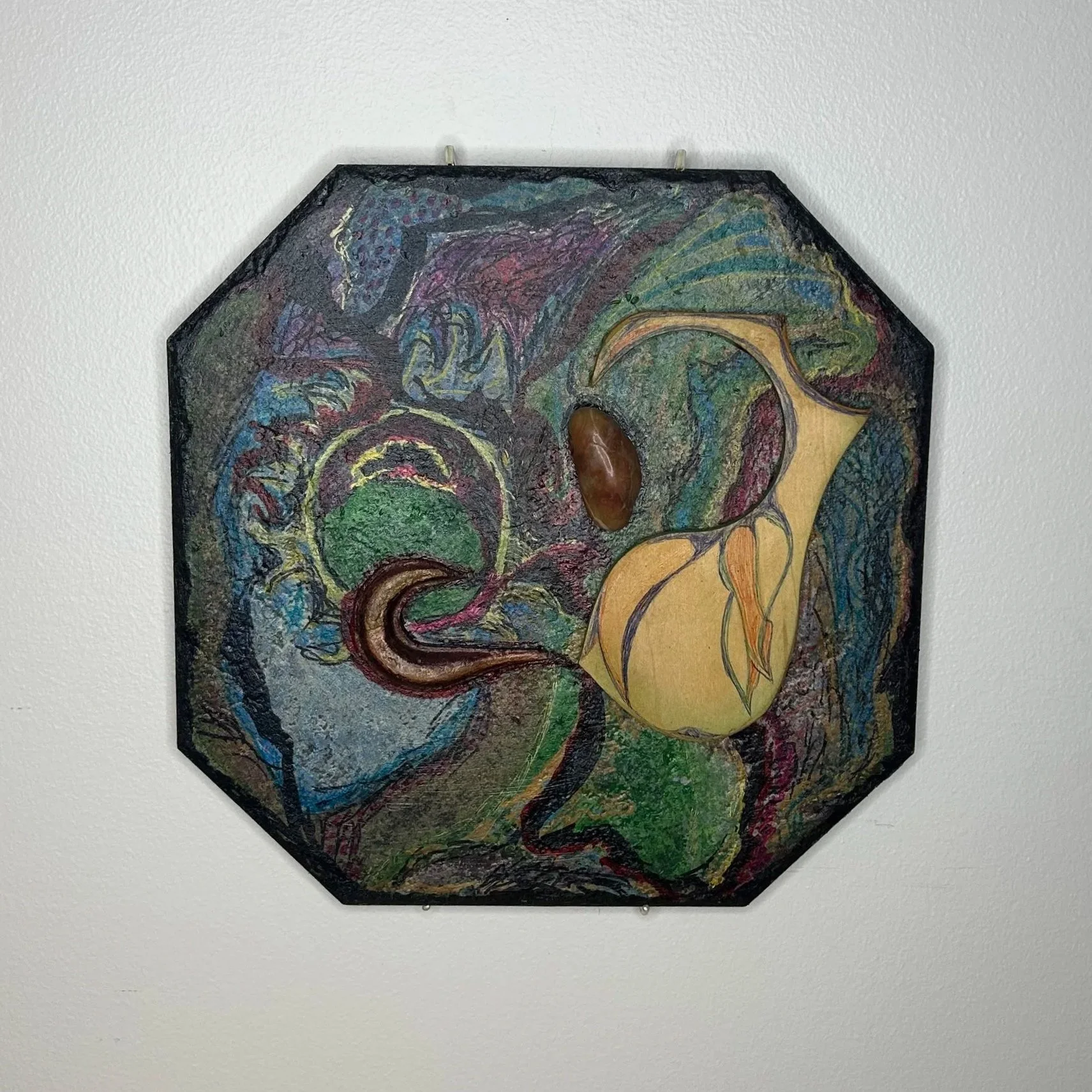 Combines natural shapes, lines, and colors, forming an organic whole. The piece can be turned around and hung in four different ways, changing one's perspective! Constructed elements to reflect cultural memory and continuity between human intention and organic form.